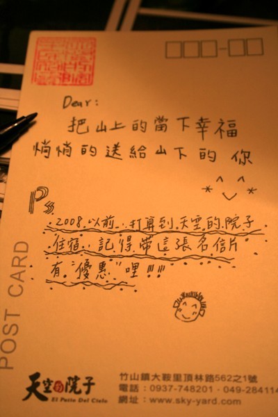 山上幸福活動又開始囉!!即日起,凡是當日住宿的旅客,可以購買院子發行的幸福明信片,寫下祝福心情,送給您最想傳達心意的人,收到明信片的主人,務必把明信片帶來院子喔!!憑明信片就可以享有當日的住宿優惠喔!!
